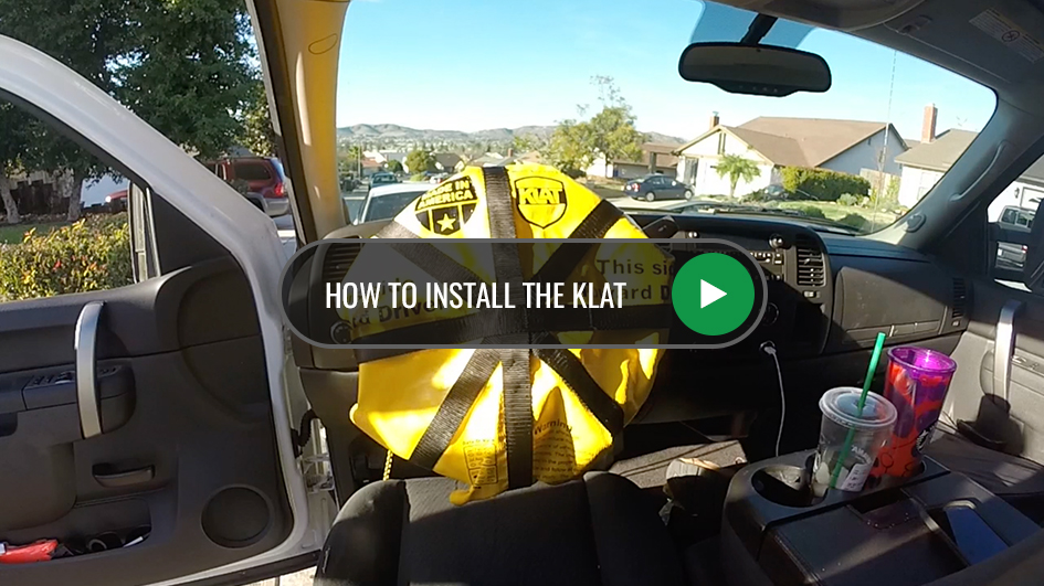 Remove KLAT from protective bag. Holding handle in one hand and cinch in the other, place KLAT device over steering wheel with logo facing driver. Pull cinch line until device is secure around steering wheel. Rescue Driver.